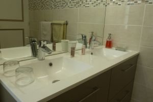 Elle dispose de sa salle de bain privative de 6 M2 équipée d'un meuble avec rangements surmonté d'une double vasque, d'une armoire de toilettes, d'une grande  cabine de douche et toilettes.