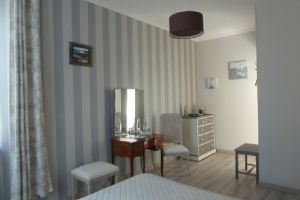 Cette chambre de 20 M2 se compose d'un lit 160 cm modulable, à la demande, en deux lits jumeaux de 80 cm x 200, de ses deux tables de chevet ,d'un meuble de rangement et d'une coiffeuse et ses chaises.