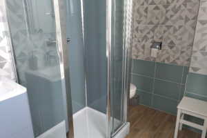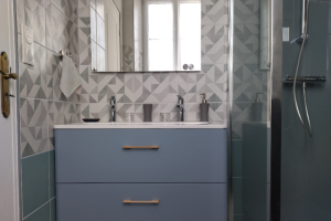 La salle de bain, pensée pour le confort de tous, est équipée d’une grande cabine de douche, d’un meuble avec rangements surmonté d’une vasque, toilettes.