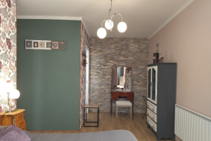 La chambre principale est équipée d’un lit 160 × 200 cm, modulable à la demande en deux lits jumeaux de 80 × 200 cm, de deux tables de chevet, d’un meuble de rangement ainsi que d’une élégante coiffeuse accompagnée de ses chaises.